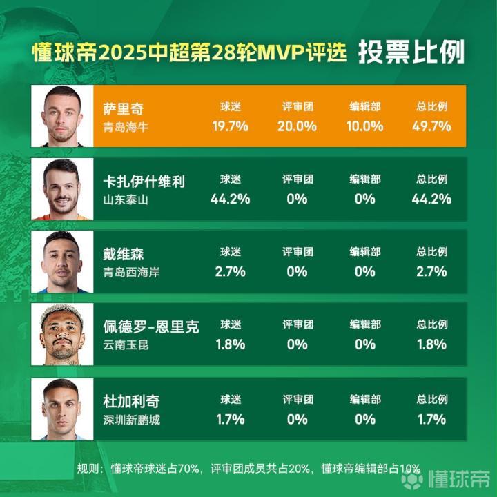 各位球迷朋友,欢迎莅临懂球帝2025赛季中超联赛MVP评选盛典。中超第28轮MVP得主现已揭晓,青岛海牛队35岁功勋队长萨里奇凭借工体之战的3球1助攻惊艳表现,以5.5%的得票率优势力压山东泰山队前锋卡扎伊什维利,成功斩获本轮中超最佳球员殊荣。